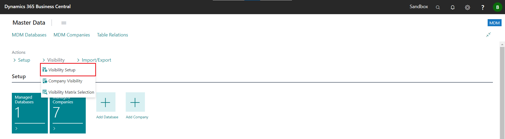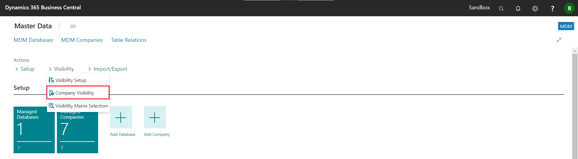 Execute the action Visibility >> Company Visibility in the MDM Role Center page.